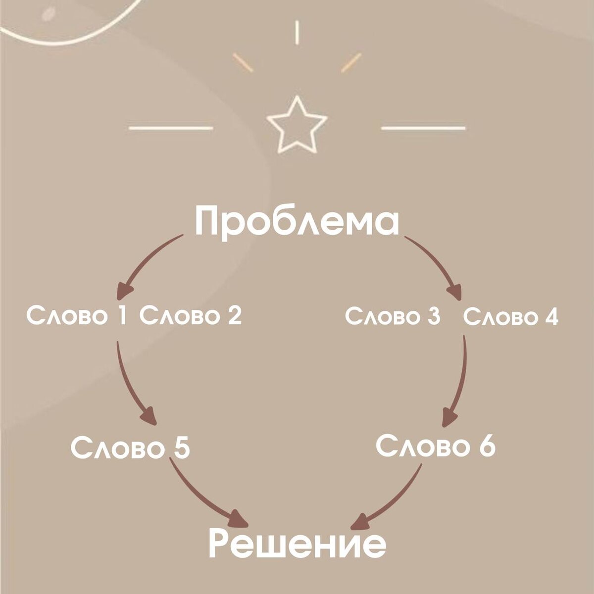 📌Практика для быстрого поиска решения проблемы Если вас давно беспокоит какая-то ситуация, но вы никак не можете понять: ◾️чем она вызвана, ◾️как выйти из неё, ◾️с чего начать решение, на помощь придёт ваше бессознательное, которое всегда знает ответы на все наши вопросы. Открыть проход к бессознательному и найти точку опоры нам поможет очень простая практика ↩️ Техника выполнения: 1️⃣ Выпишите слово, которым можно охарактеризовать вашу проблему (например, семья/ деньги/ удовольствия) 2️⃣ Справа и слева от главного слова напишите по 2 слова-ассоциации: Деньги: работа (1) + карьера (2) + зарплата (3) + офис (4) 3️⃣ Теперь объедините пары слов (1+2) и (3+4) еще одним словом-ассоциацией Работа + карьера = рост Зарплата + офис = стабильность 3️⃣ И последнее — на получившуюся пару слов придумайте общую ассоциацию Рост + стабильность = повышение Получившееся слово — то, чем на самом деле вызвано ваше затруднение, и то, что нужно решить в первую очередь. Несколько важных нюансо