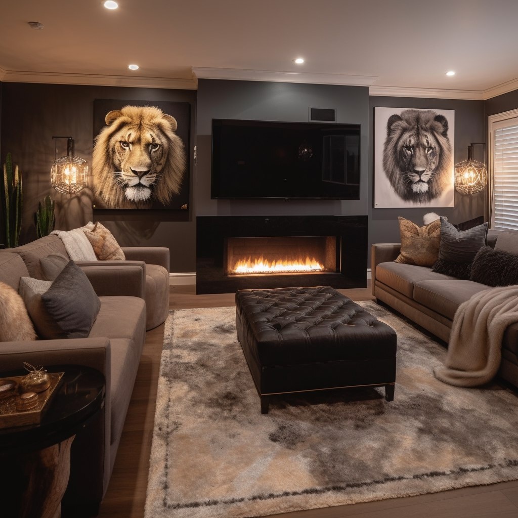 Создано на основе запроса: Romantic living room with dark recliner couches, led lights behind a large tv, soundbar, lion canvas picture on