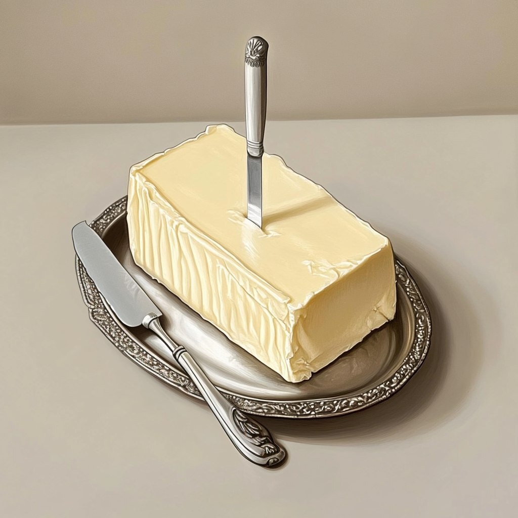 Создано на основе запроса: An illustration of a block of butter on an oval vintage silver dish, a knife stab in the center of the butter, no