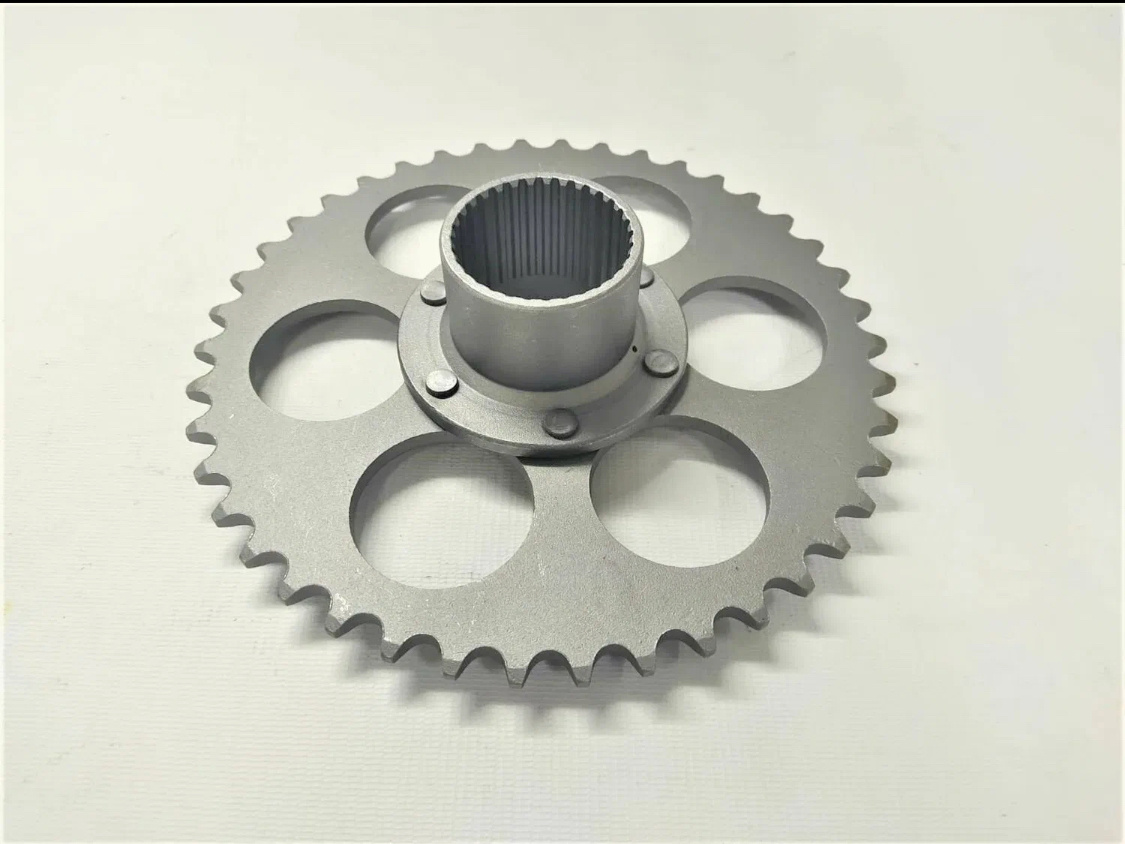 В предыдущей статье я рассказал об установке приводного вала на раму, теперь необходимо установить звезду для цепной передачи. Звезду я выбрал от мотоцикла Иж. Ведомая звезда на таких мотоциклах не меняется на меньшую и большую по числу зубьев. Меняется только ведущая. Я выбрал такой же принцип сборки цепной передачи. Ведомая звезда по количеству зубьев будет всегда одинаковой, ведущая будет меняться в зависимости от условий эксплуатации. При всех этих условиях ведомая звезда должна иметь возможность меняться, т.к. у звезды будет износ. Задняя звезда мотоцикла Иж соединена с втулкой на клепки. Так как эта звезда устанавливается на мотоцикл, идет с деталью для установки на колесо, закрепленной на заклепки. Для установки на багги, данная втулка не нужна. Поэтому я высверлил заклепки и разобрал данное соединение. После этого звезда готова к установке и имеет 6 отверстий для ее крепления. После подготовки звезды, было выточено на токарном станке, новое крепление ведомой звезды на приводную