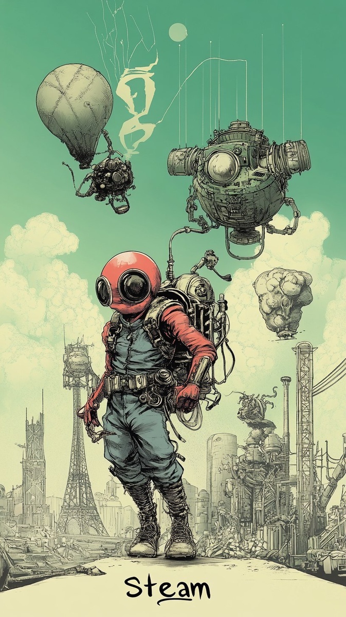 Создано на основе запроса: Well designed Title "Steam", in steampunk comic book, 🕰️ ⚙️ 🐝 🦋👻 💀 🪽 👾 🤖 🤖 🤖, by moebius
