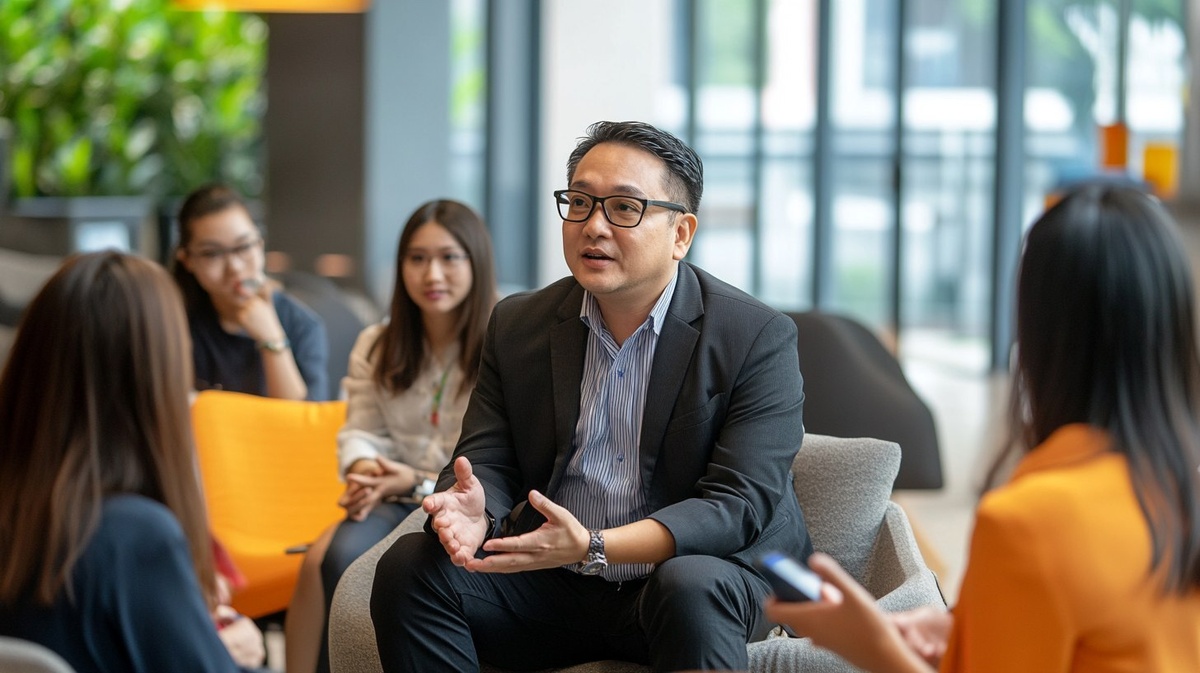 Создано на основе запроса: 50 year old Singapore male, Chief Tech officer, wears glasses with black frame, side parting thin hair, high headline, talking to 30 people in main lobby of his company