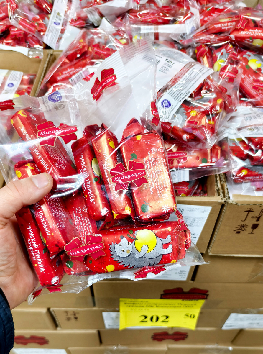 Всем привет! Пришло время пробы конфет. В Светофоре большой выбор различных конфет и сладостей. Много позиций не самого лучшего качества, но возможно найти что-то действительно вкусненькое. Сегодня на обзоре Минский грильяж от Коммунарки за 202 рубля. Надеюсь что это не подделка. Впервые вижу такие конфеты с ёжиком. Изготовлено в Беларуси. Импортер: ООО "Коммунарка", г. Москва. Интересно, что их даже в США отправляют. Состав, конечно, не самый лучший. Много ароматизаторов, заменители какао масла, заменители молочного жира. По-любому из пальмового масла, как в дубайском шоколаде, которую я пробовал в прошлом обзоре. Но здесь явно это не указано. Масса 520 граммов. Срок годности в норме. Конфетам уже четыре месяца. В одной конфете 50 граммов. Почти дотягивает до современных шоколадок по 70 граммов. В упаковке 11 штук. Ровно 550 граммов, даже больше чем указано на упаковке. Получается одна конфета стоит чуть больше 18 рублей. По размерам она такая же как белорусские конфеты Белове