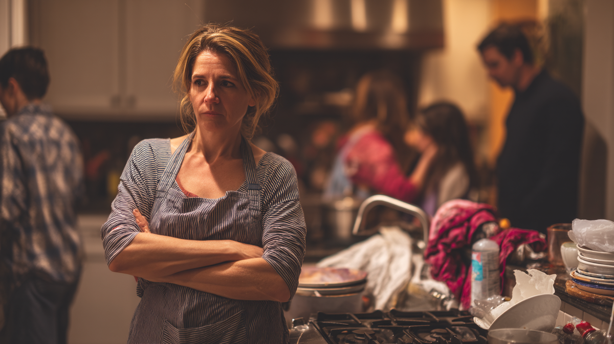 Когда семья разошлась, Елена осталась одна среди грязной посуды и беспорядка. Она механически мыла тарелки, вытирала стол, но в голове крутились мрачные мысли.