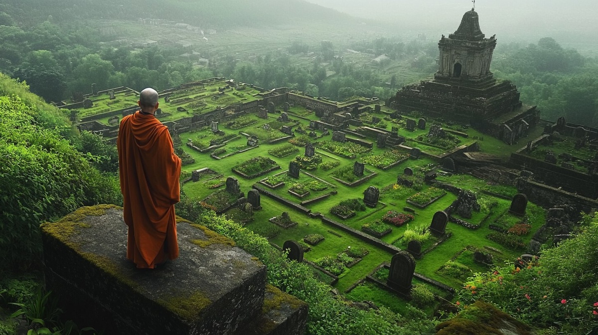 Создано на основе запроса: The monk standing on a hill overlooking graves turned into gardens