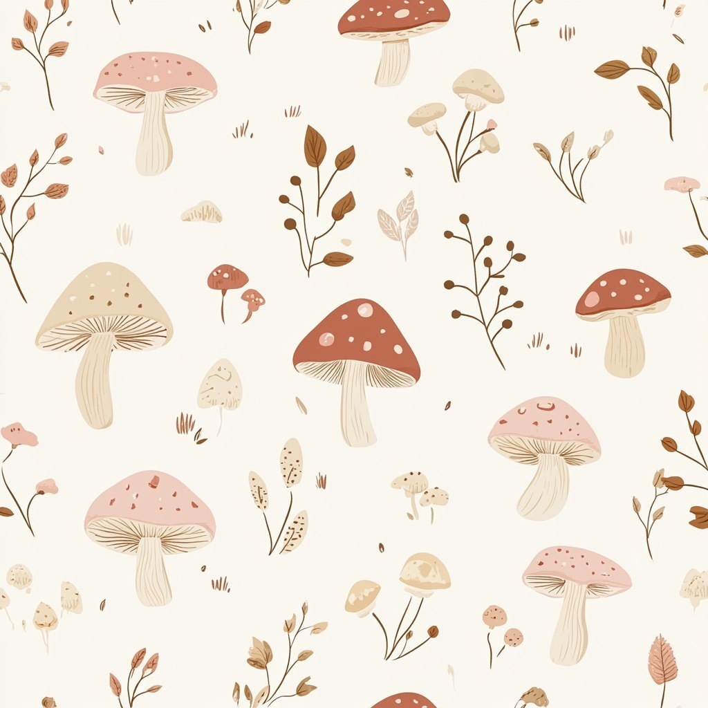 Создано на основе запроса: repeating pattern, small mushrooms, handwritten Psalm snippets, floral vines, light pink and beige color palette