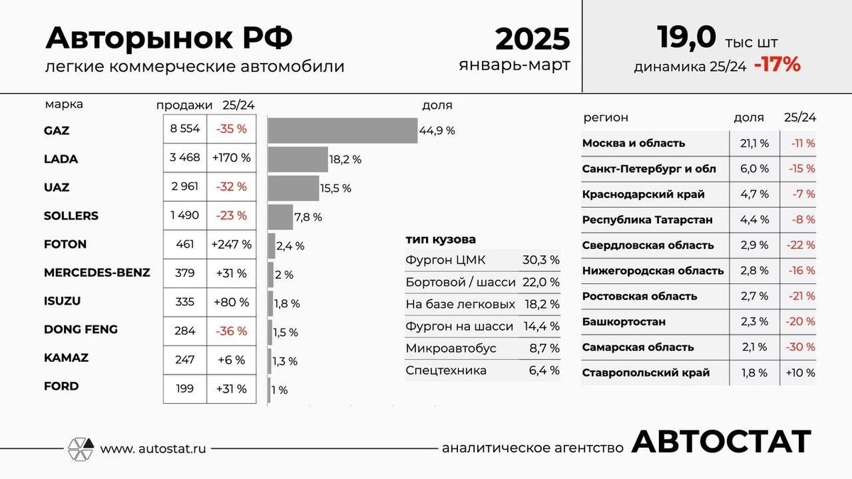 Рынок легких коммерческих автомобилей (LCV до 3,5 тонн) за первые три месяца 2025 года составил 19 тыс. штук Это на 17% меньше, чем в январе-марте 2024 года. «ГАЗ»уверенно удерживает лидерство (45% рынка). А внутри модельного ряда более половины (54%) приходится на Газель Next. «Спасителем» сегмента LCV в нынешнем сезоне выступает LADA Largus (18% рынка). Было реализовано 3468 «Ларгуса» в коммерческой версии, что в 2,7 раза больше, аналогичного показателя прошлого года. УАЗ (15,5% рынка) и Соллерс (7,7% рынка) сократили продажи на 32% и 23% соответсвенно. А пятерку лидеров вошел китайский Foton. Динамика продаж потрясает (+247%), но абсолютные цифры и доля рынка (2,4%) пока не велики. Более 30% рынка LCV приходится на цельнометаллические фургоны. Чуть более 20% на бортовые версии и шасси, чуть менее 15% на фургоны, построенные на шасси. Микроавтобусы занимают менее 9% рынка. Каждый пятый LCV (21%) продан в Московском регионе, 6% в Санкт-Петербурге. Среди топ-10 регионов в 1 к