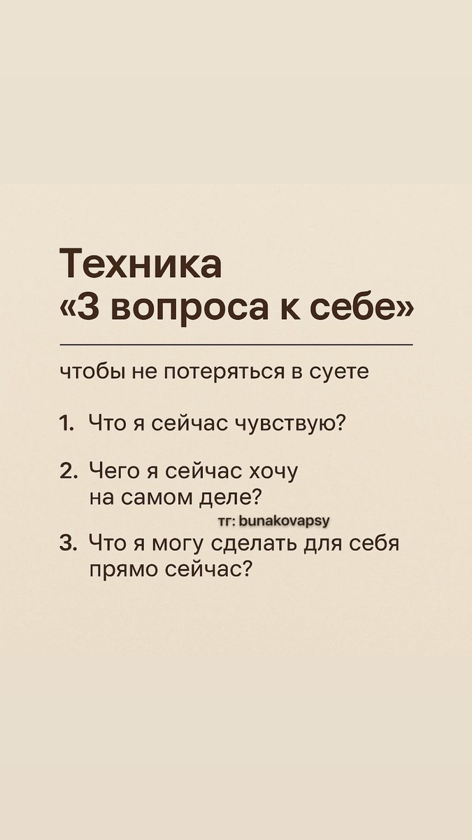 Иногда мы ловим себя на том, что день прошёл — а мы не помним, чем он был наполнен. ⠀ 📱 Лента новостей, задачи, кто-то что-то сказал, и вот уже тревога, усталость, внутренний шум. В такие моменты помогает простая, но сильная техника — «3 вопроса к себе». Она возвращает внимание внутрь и помогает понять: *а я вообще где сейчас?* Попробуйте задать себе эти вопросы вечером или в течение дня: 1. Что я сейчас чувствую? Не “в целом норм”, а честно: злюсь? тревожусь? устала? 2. Что я сейчас хочу на самом деле? Не что “надо”, а *что я действительно хочу прямо сейчас?* 3. Что я могу сделать для себя прямо сейчас? Не глобально. Маленькое, но реальное: попить воды, сделать вдох, выключить уведомления. 🌱 Если делать это каждый день — вы начнёте лучше слышать себя, замечать сигналы до того, как “накроет”. Это и есть путь к осознанности — через внимание, а не контроль. Напишите себе эти вопросы в заметки, и возвращайтесь к ним, когда чувствуете, что теряетесь. Е