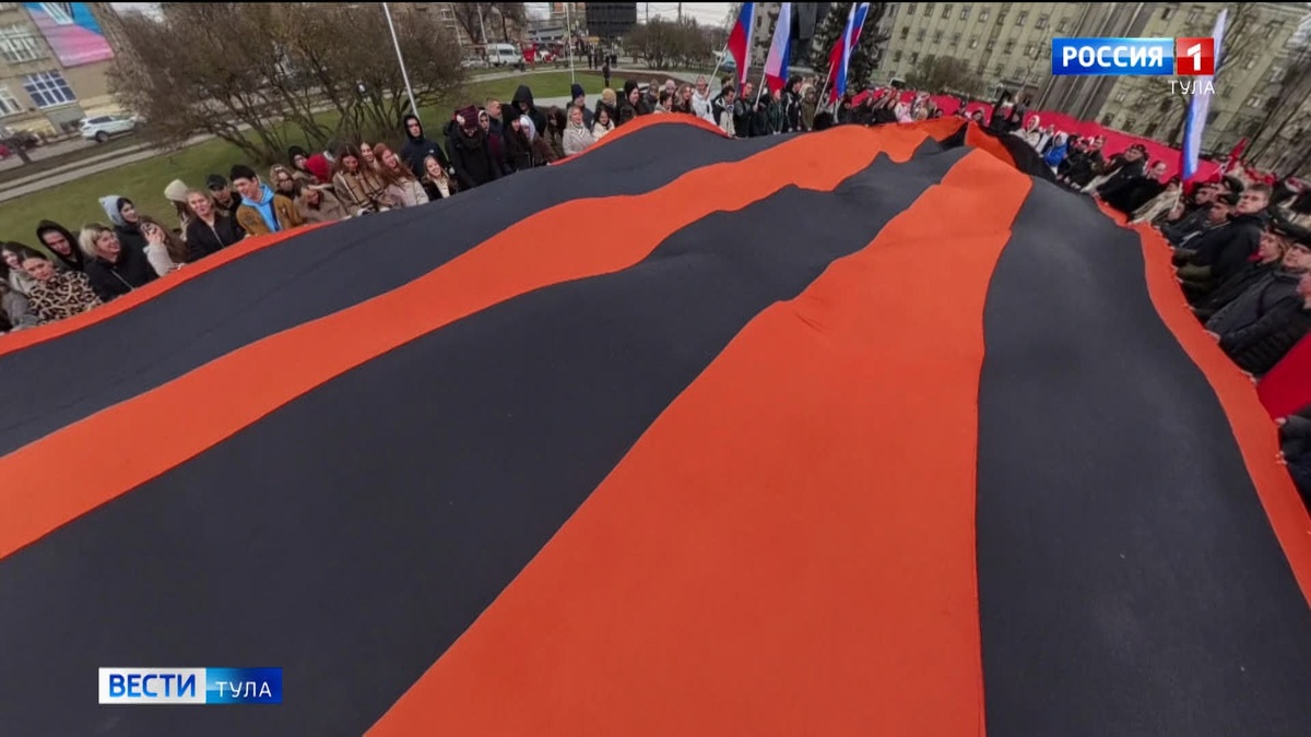 К вечному огню на Площади Победы вновь возложены цветы. Акция, организованная областным отделением Всероссийской общественной организации ветеранов “Боевое братство” при поддержке регионального правительства и общественной палаты в Туле собрала более 800 человек. Алексей Эрк, глава города Тулы: И кажется, так давно это было, победный май 1945 года. Но время не властно над памятью. Юрий Цкипури, председатель Общественной палаты Тульской области: Мы с большим трепетом и восхищением вспоминаем тех героев, кто воевал на фронтах, кто беззаветно трудился в тылу, и самое главное, что они передали чувство любви к Родине, патриотизма и ответственности за страну всем последующим поколениям. Юнармейцы, участники патриотических организаций, студенты вузов и колледжей. Акция “Равнение на Знамя Победы” даёт возможность каждому пришедшему соприкоснуться с историей через символы Победы. Штурмовое знамя было установлено на Рейхстаге в мае 1945 года. Почётная миссия развернуть гигантскую копию площадью