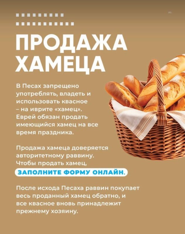 ПРОДАЖА ХАМЦА ОНЛАЙНВнимание! Доверенность должна быть отправлена не позднее 10:00 московского времени 11 апреля 2025 года.Заполнить онлайн форму для продажи хамеца можно по ссылке https://ravvinat.ru/ru/general_information/chometz/chometz/