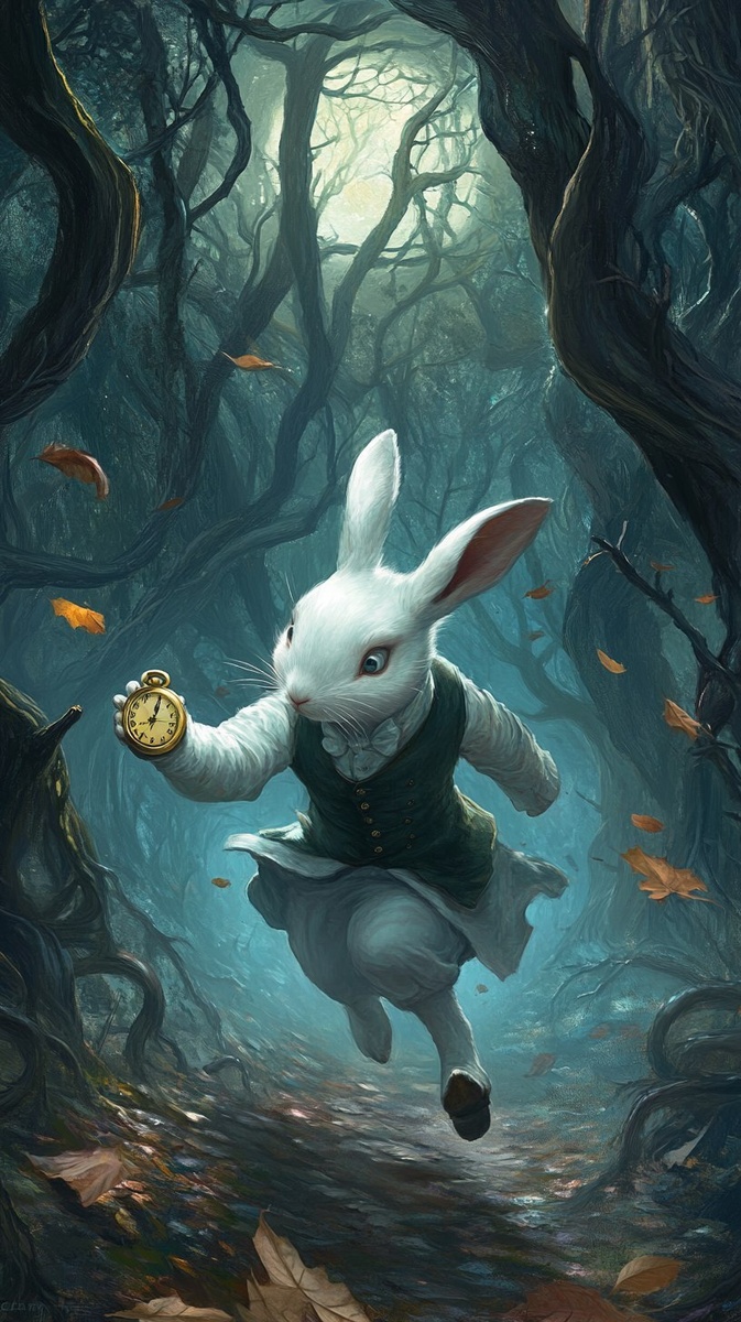 Создано на основе запроса: A white rabbit in a waistcoat running through a dark, enchanted forest, glancing nervously at a golden pocket