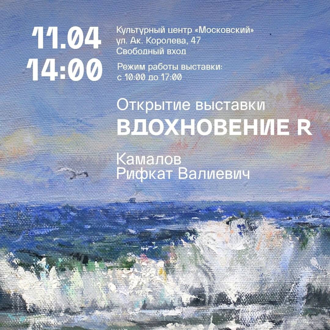Выставка Камалова Рифката Валиевича «Вдохновение R», 0+ 🗓️ 11 апреля - 4 мая ⏰ 10:00-17:00 пн-вс 💸 бесплатно 🏫 КЦ "Московский" 📍 ул. Академика Королева д. 47 ❗️Открытие выставки 11 апреля, 14:00 Выставка названа в честь Молодежного художественного салона «ВДОХНОВЕНИЕ R», основанного в 2003 году для выявления талантливой молодежи. ➡️ ПОДРОБНОСТИ ⬅️ ❗️ Детская Афиша | Казань Больше информации в нашей группе, переходите