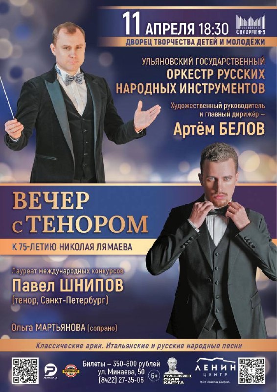 Вечер с тенором 🗓️ 11 апреля в 18:30 📍Дворец творчества детей и молодёжи Этот концерт объединит красоту тембра голоса яркого оперного певца Павла Шнипова, нежное сопрано Ольги Мартьяновой и магию музыкантов-виртуозов оркестра. Высокое эмоциональное состояние вечера создадут вокальные произведения с новой глубиной прочтения: арии из опер Джузеппе Верди, Джакомо Пуччини и Гаэтано Доницетти, которые плавно перетекут в итальянские и русские народные песни. Подробнее Скидка 10% по промокоду культура 💝 #11апреля25
