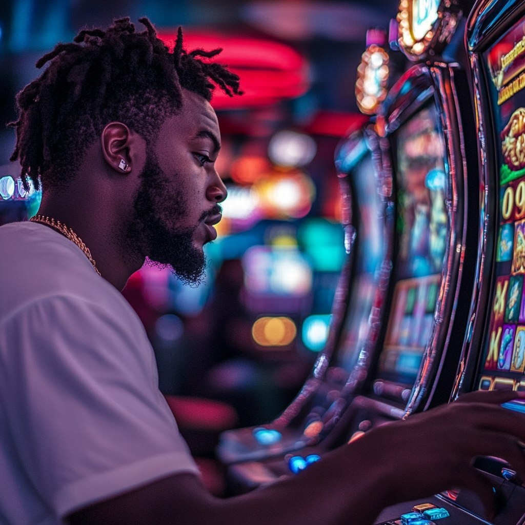 Создано на основе запроса: a black male playing slots machines in Las Vegas but he is really made because he’s losing