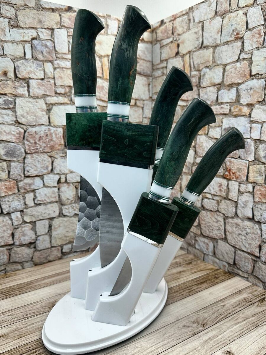 Кухонный набор из дамасской стали в 950 слоев покрытый никелем готов. Рукоять на каждом ноже выполнена из акрила белого и стабилизированной карельской березы зеленой. Подставка выполнена из акрила белого. Ножи заточены в бритву. Твердость каждого клинка (HRC): 62 Цена за набор: 85.170 рублей. В комплекте идут ножны из натуральной кожи. Можем сделать формованные ножны +8000 рублей. Для заказа писать на @Nazarklinokbot или по тел +79101343831 WhatsApp/Viber