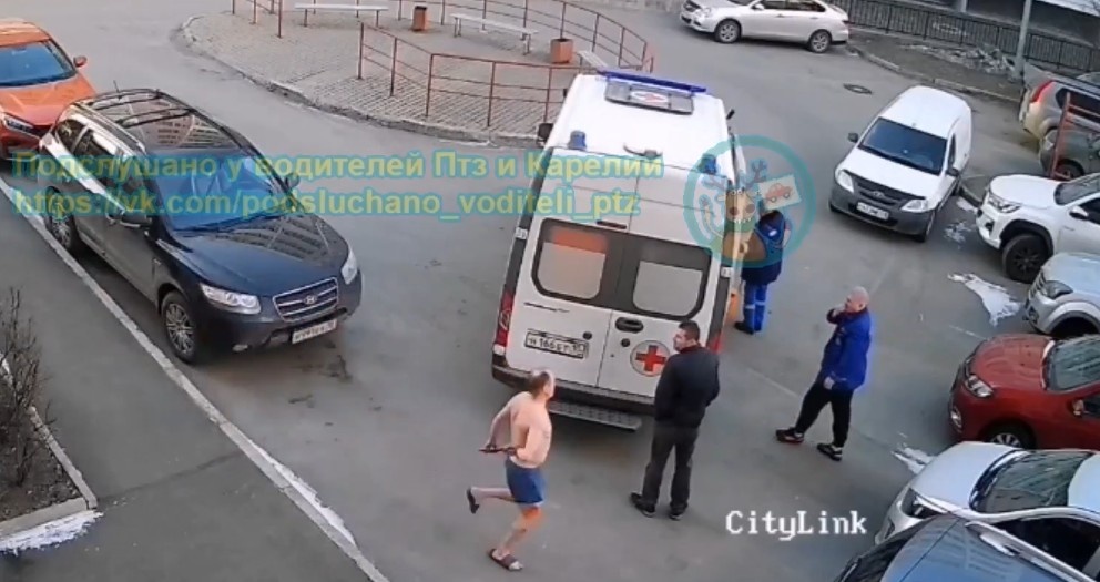 В сети опубликовали видео нападения пьяного мужчины на врачей, приехавших к его матери. Видео нападения неадекватного мужчины на врачей скорой помощи в Петрозаводске было опубликовано в группе «Подслушано у водителей Птз и Карелии». На кадрах видно, как мужчина в домашней одежде выскакивает из подъезда вслед за медиками и пытается их ударить. Буяна успокаивают сами работники скорой и свидетель происшествия, затем его прогоняют. Но спустя какое-то время неадекват выскакивает на улицу уже полуголым, держа в руках предмет, похожий на нож. Он начинает гоняться за медиками. В конце концов, приезжают правоохранители, которые забирают мужчину в участок. Напомним, ранее стало известно о нападении пьяного мужчинв на работников скорой, приехавших к его матери. Инцидент произошёл 5 апреля на улице Мичуринская. фото: © Скриншот с видео: «Подслушано у водителей Птз и Карелии» / VK