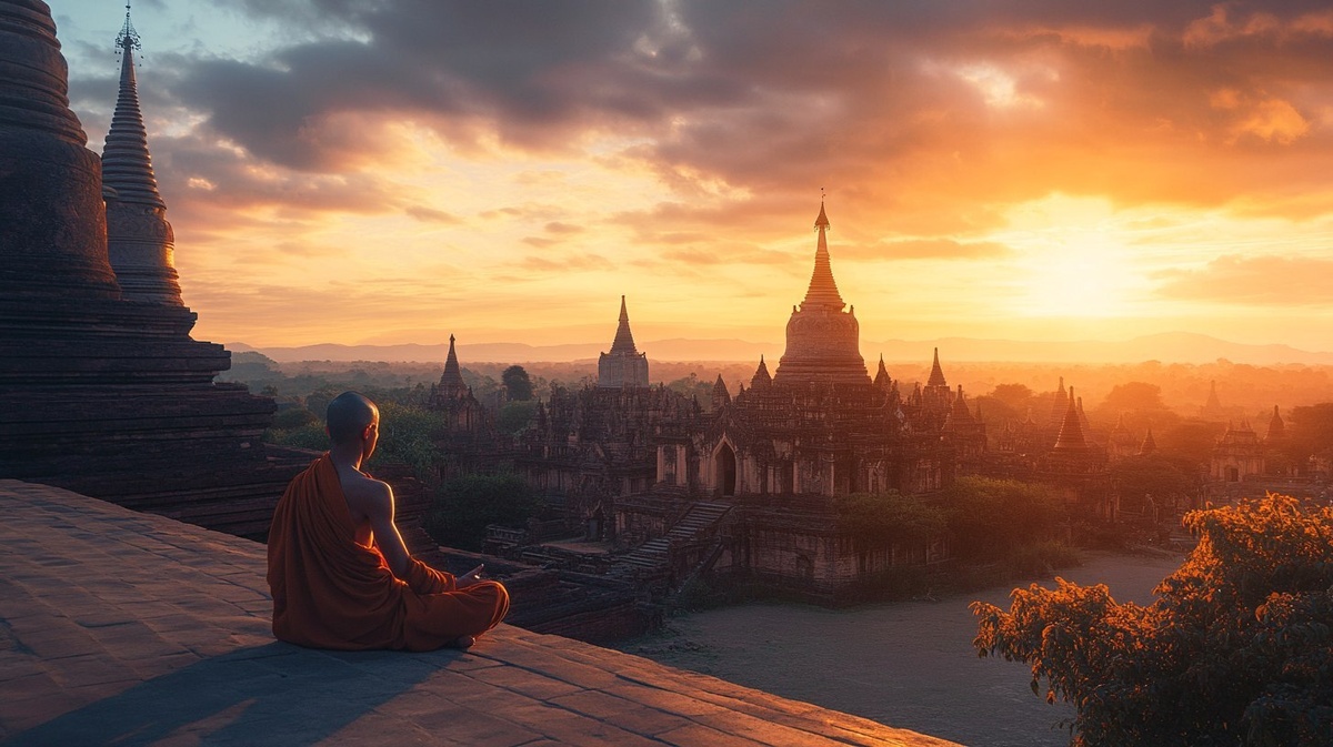 Создано на основе запроса: The monk meditating beneath a sky split between sunrise and twilight