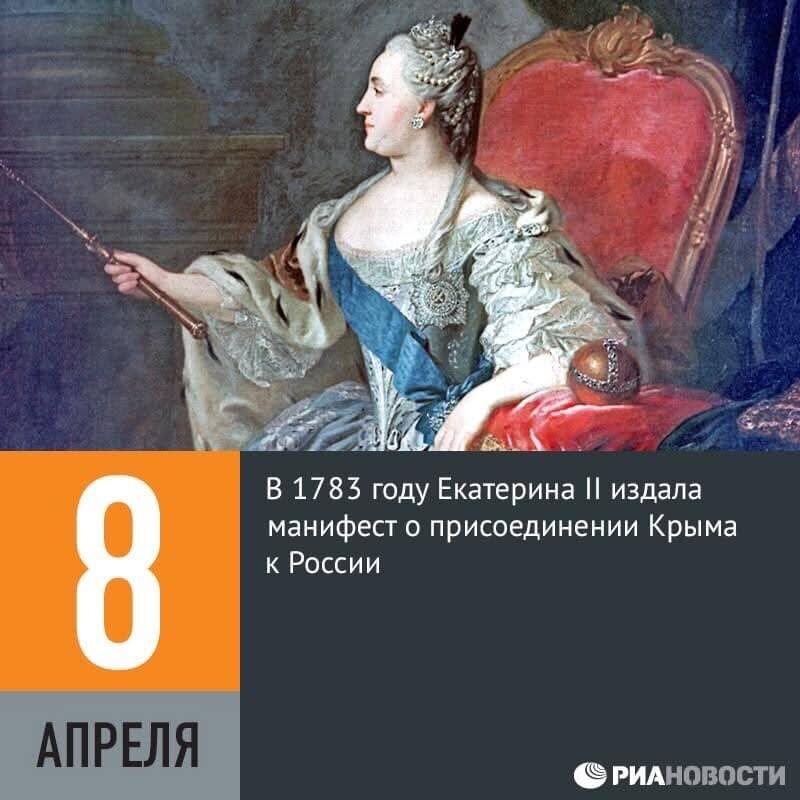 8 апреля 1783 года Екатерина II издала манифест о присоединении Крымского полуострова, Тамани и Кубани к Российской империи