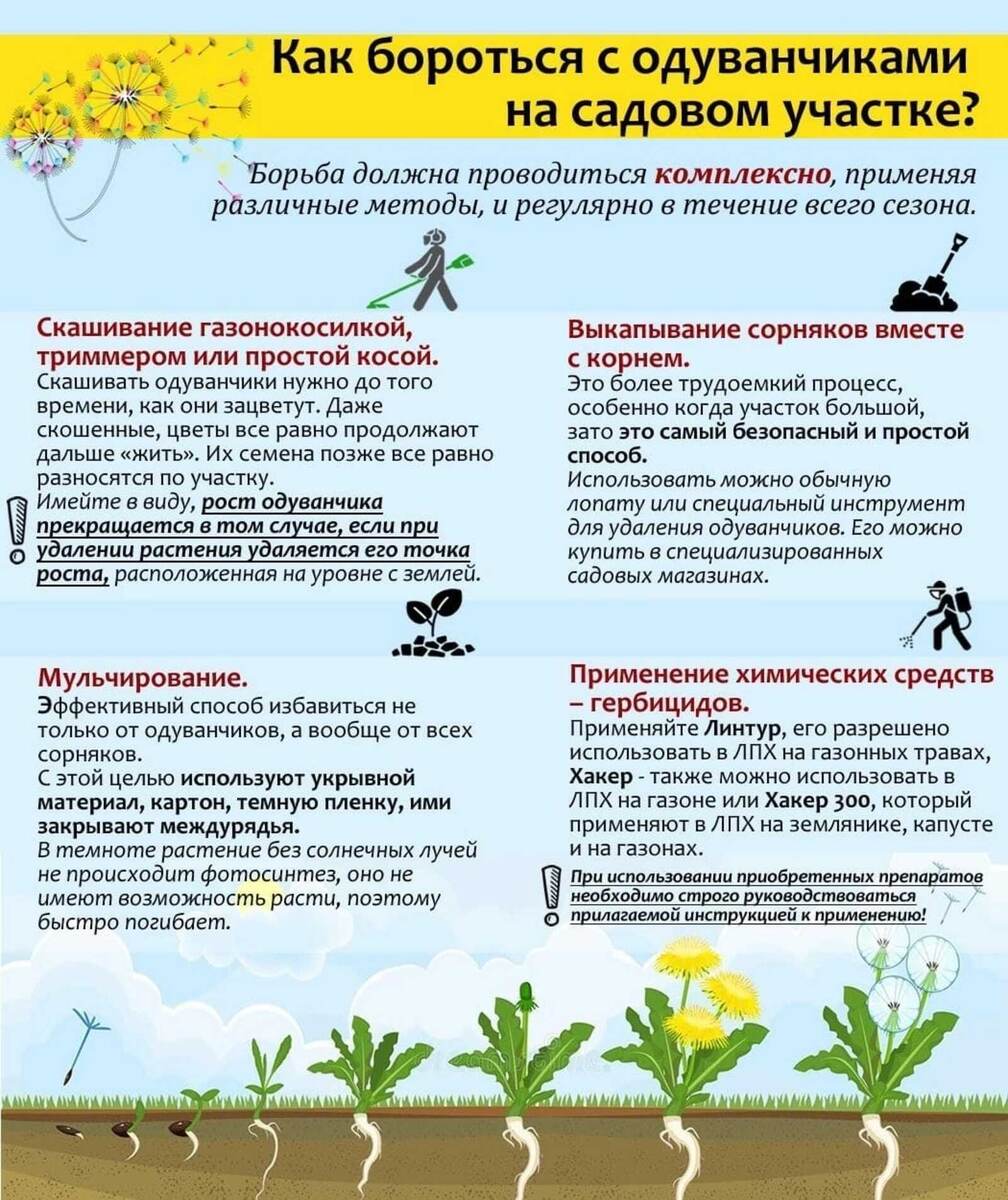 Как же побороть этот сорняк? Просто скосить Самый прстой способ - скосить одуванчики. Делать это нужно, пока они не зацветут. Скошенные одуванчики - не дадут семян, а значит - не будут пролжать захватывать ваш огород. Этот способ избавит от одуванчиков на участке на весь сезон. Застелите междурядья грядок черным мульчирующим нетканым материалом. Сорнякам нужен свет, а такое полотно его не пропускает. В итоге одуванчи
