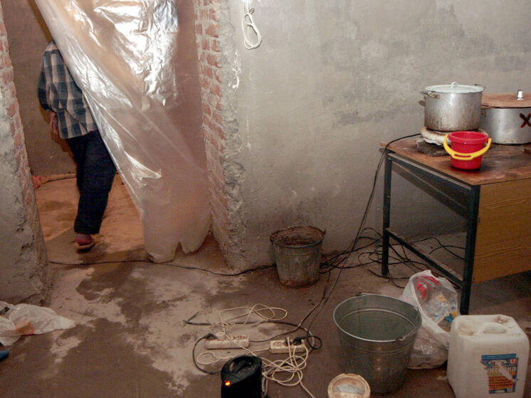 Близ них - пластиковые контейнеры, выполняющие роль тумбочек: на одном располагалась жестянка с окурками и пара грязных кружек, на втором - лампочка, подключённая к оголённому проводу. Интерьер дополняла, сооружённая в сыром углу, импровизированная кухня: слегка обгоревший чайник, газовая горелка и алюминиевые миски.