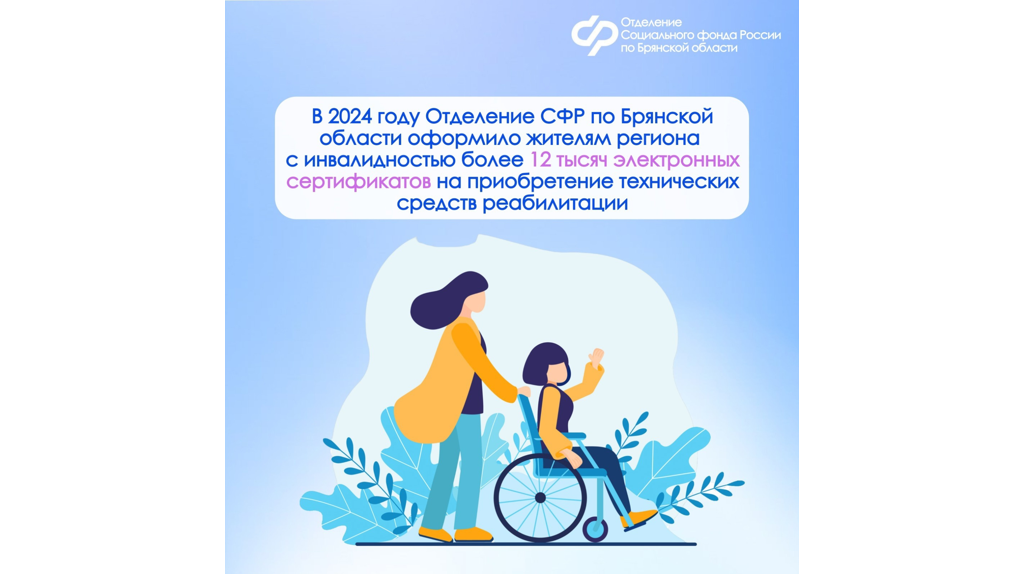 В 2024 году Отделение СФР по Брянской области оформило жителям региона с инвалидностью более 12 тысяч электронных сертификатов на приобретение технических средств реабилитации (ТСР). Они приобрели более 6,8 тысяч изделий: кресла-коляски, ходунки, слуховые аппараты, протезы и другие. Получить сертификат могут граждане с установленной инвалидностью и назначением ТСР в индивидуальной программе реабилитации или реабилитации гражданина. Для этого нужно: На оформленный сертификат Соцфонд зачисляет определённую сумму, которую гражданин может потратить на приобретение техсредства, рекомендованного индивидуальной программой. Сами деньги на карту не перечисляются, а резервируются в Федеральном казначействе до совершения покупки. Кроме того, с 2025 года можно подать заявление на замену ТСР за 60 дней до окончания срока эксплуатации текущего изделия. Это позволит исключить периоды, когда человек может остаться без необходимого технического средства реабилитации. Брянские инвалиды получили более 1