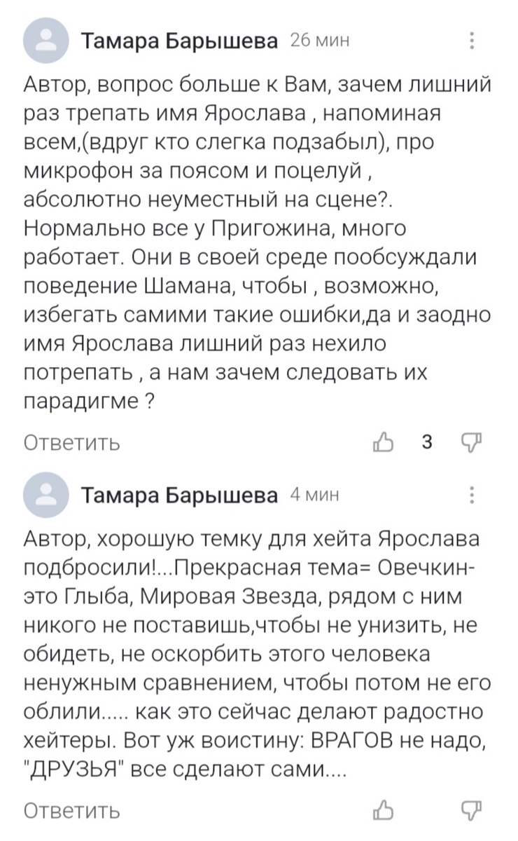 Не все знают , что мои комментарии не видны. Плюс к тому и Тамара, впервые появившись, грозно поставила мне на вид аж под двумя статьями. Придётся реагировать . Тамара, треплете и треплетесь тут только вы. Пытаясь эстетично отстоять реноме самокритика всея эстрады... Тут понимаете в чём дело? Микрофон, где бы он ни был, уже давно никого не трепыхает, окромя стайки хейтеров и продюсеров с пониженной интеллектуальной ответственностью ... Вы из чьих будете? Я ответил на слова Иосифа, не более того. Вы можете следовать парадигме Иосифа и абсолютно уместно целоваться по свадебкам... Второе. Овечкин - звезда хоккея и простой русский мужик. Шаман - звезда сцены и простой русский парень. В моей статье есть фото, где Овечкин стоит рядом с Путиным и Трампом. Могу ли я буквально воспринимать ваши слова "рядом с ним никого не поставишь, чтобы не унизить, не обидеть, не оскорбить..."? Могу ли я предположить, что вы считаете Ярослава более значимой фигурой, нежели президент России? Ведь вас зацеп