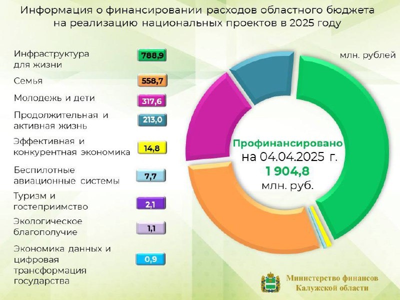 📌Информация о финансировании расходов областного бюджета на реализацию национальных проектов в 2025 году. В соответствии с уточненной сводной бюджетной росписью областного бюджета на 2025 год на реализацию национальных проектов в 2025 году предусмотрено 12 135,1 млн. рублей. Финансирование национальных проектов по состоянию на 04.04.2025 года составило 1 904,8 млн. рублей.