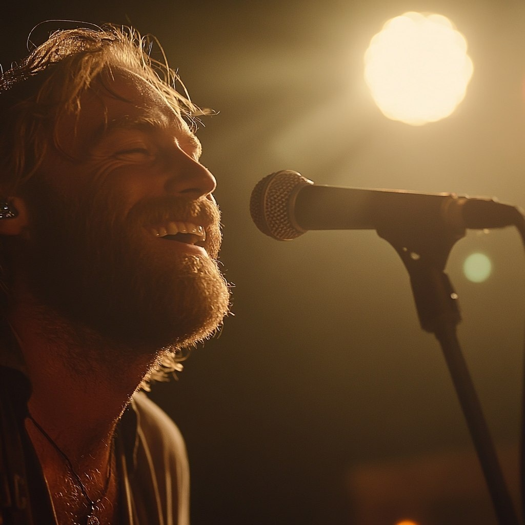 Создано на основе запроса: Cinematic 16:9 image. Extreme close up. On stage. A mid-30's disheveled looking rockstar stands at a microphone stand, smiling contentedly. --- Автоперевод: Кинематографический 16: 9 Изображение. Как тебе это изображение? 🤔 https://dzen.ru/id/65c0c65c86e4f837c27b24d7 #ИИ #AI #нейросеть #midjourney #art