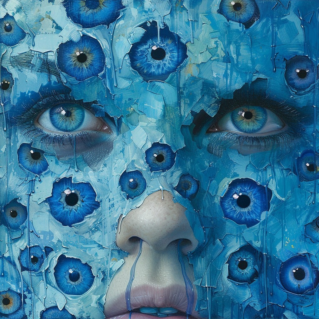 Создано на основе запроса: two pairs of eyes surrounded by blue evil eye symbols that create a human face
