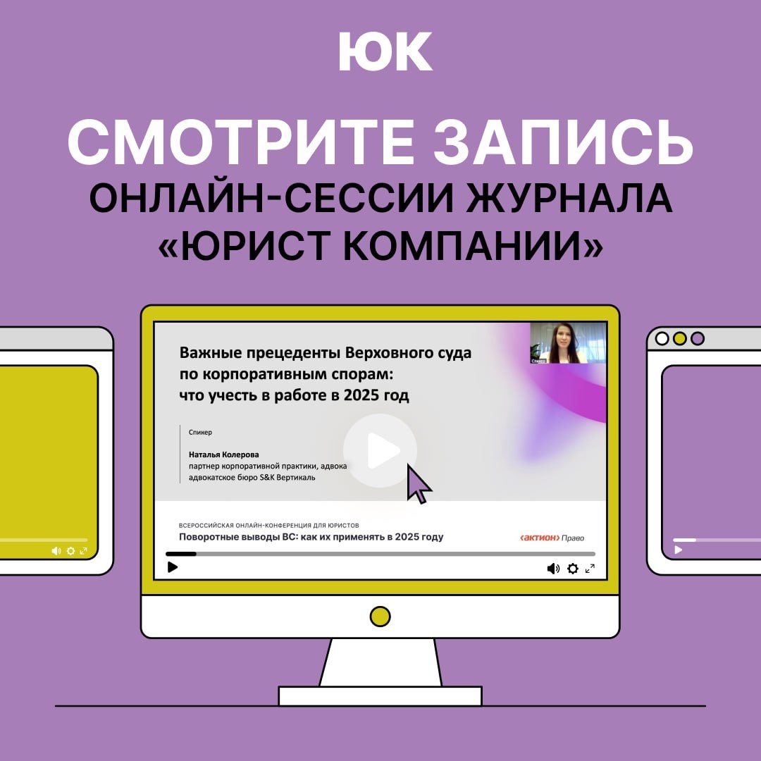 Делимся записью онлайн-сессии: «ВС разворачивает практику корпоративных споров: как применять новые подходы в 2025-м». 25 марта состоялась онлайн-сессия журнала «Юрист компании», на которой Наталья Колерова, партнер корпоративной практики S&K Вертикаль, разобрала последние позиции ВС по «корпоративке», которые меняют сформировавшуюся практику. ✔️ По заявке откроем бесплатный доступ к записи и другим статьям журнала «Юрист компании» по теме сессии. Узнаете: ⁃ Как суды сейчас реагируют на требования участников и акционеров предоставить документы компании; ⁃ Какие еще позиции учесть в корпоративной работе, смотрите в видео; ⁃ В каких случаях суды теперь стали исключать участников из ООО, как рассматривают групповые корпоративные иски, а также дела по «спящим акционерам». ⏩️ Отдельно спикер поделилась новой практикой по деприватизации и ответственности бенефициаров. ▶️ Оставить заявку на доступ к записи>>
