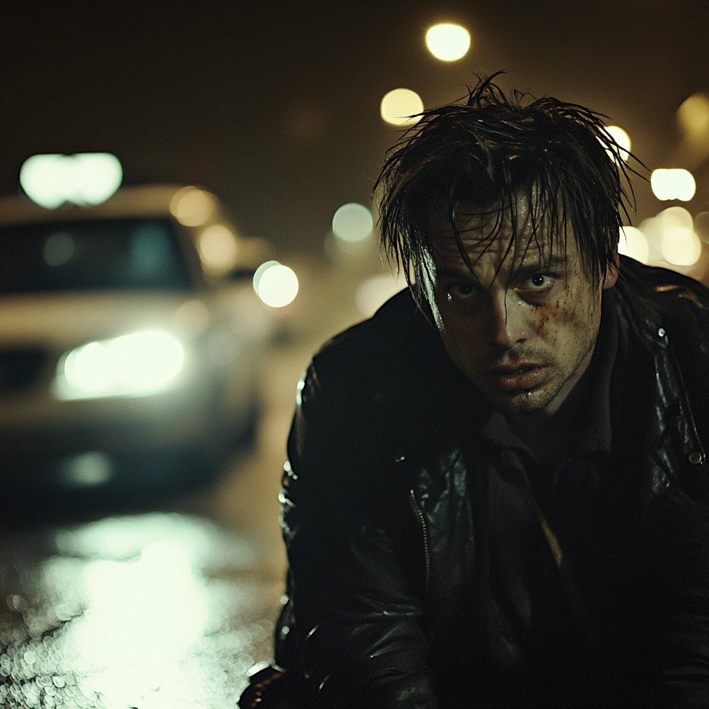 Создано на основе запроса: Cinematic 16:9 image. Night scene. On a city street. Middle of the street. Close up. A disheveled 35 year old rockstar has almost been hit by a car. The car sits right next to him. The driver holds down their horn. The headlights flash into him. He looks towards the curbside, suddenly extremely troubled by something he sees in the distance. --- Автоперевод: Кинематографический 16: 9 Изображение. Хорошо выглядит? 🤔 https://dzen.ru/id/65c0c65c86e4f837c27b24d7 #ИИ #AI #нейросеть #midjourney #art