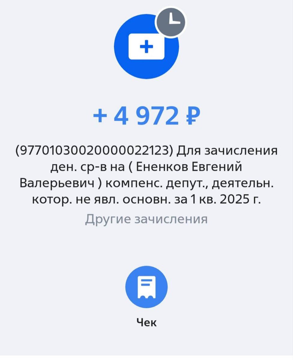 Четырехзначная зарплата депутата Очень часто в интернете встречаю мнение, что раз депутат — значит, живу в роскоши, получаю миллионы и могу всем и каждому помочь финансово. Люди пишут с просьбами о деньгах, лекарствах, продуктах, лечении и прочем. Иногда я действительно могу помочь финансово. Подключаю все возможные ресурсы и инструменты. Но давайте честно: это решает проблему лишь на один раз. А в следующем месяце что? Поэтому в ЛДПР мы подходим к вопросам глубже — не просто реагируем, а работаем системно, на законодательном уровне, чтобы устранять причины, а не только последствия. Для тех, кто думает, что у меня миллионы, показываю свою зарплату депутата за первый квартал 2025 года: 4 972 рубля за три месяца работы. Это не оклад, а моя реальная зарплата, так как я работаю на общественных началах. У меня нет водителя, нет служебной машины, нет особняка или резиденции, и уж точно нет миллионов на карте. Я живу, как и большинство из вас — обычной жизнью. Но я счастлив, потому что мо