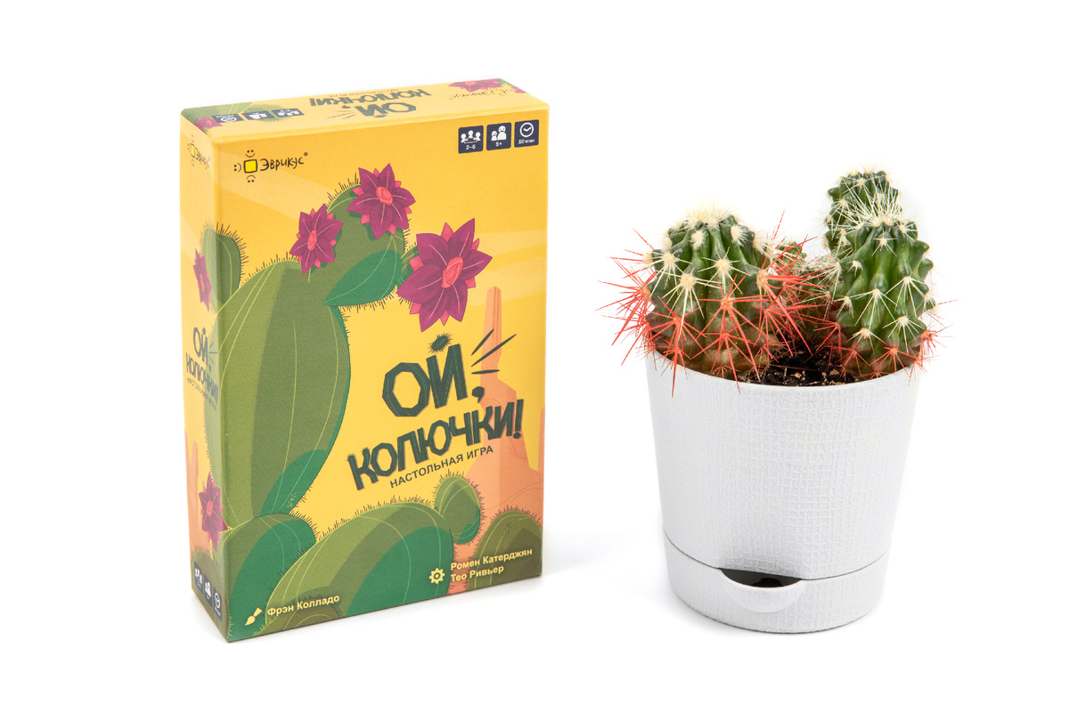 Кактусы тоже могут цвести! Обычно как раз с апреля по июнь, так что сейчас самый сезон! И, если держать колючее растение дома не получается, а вот собрать из их цветов букет хотелось бы, то игра «Ой, колючки!» может вам помочь. Чем порадуют «Ой, колючки!»? • Очаровательные картинки • Максимально простые правила • Короткие партии и желание сразу сыграть ещё раз «Ой, колючки!» - простая задорная карточная игра, которая подойдет любой компании любого возраста! В небольшой коробке вас ждут цветущие кактусы и парочка других обитателей жарких пустынь. Вам предстоит выбирать кактусы и решать, с какой из четырёх сторон к ним подступиться, чтобы не уколоться и получить цветок. Чем больше цветков на кактусе, тем больше колючек на обороте карточки! Выбирайте приглянувшийся кактус и решайте, с какой из четырёх сторон к нему подступиться, чтобы не уколоться и получить цветок. В свой ход вы выбираете одну из карточек и объявляете всем, за какую из 4 сторон карточки вы возьмётесь. Переверните кар