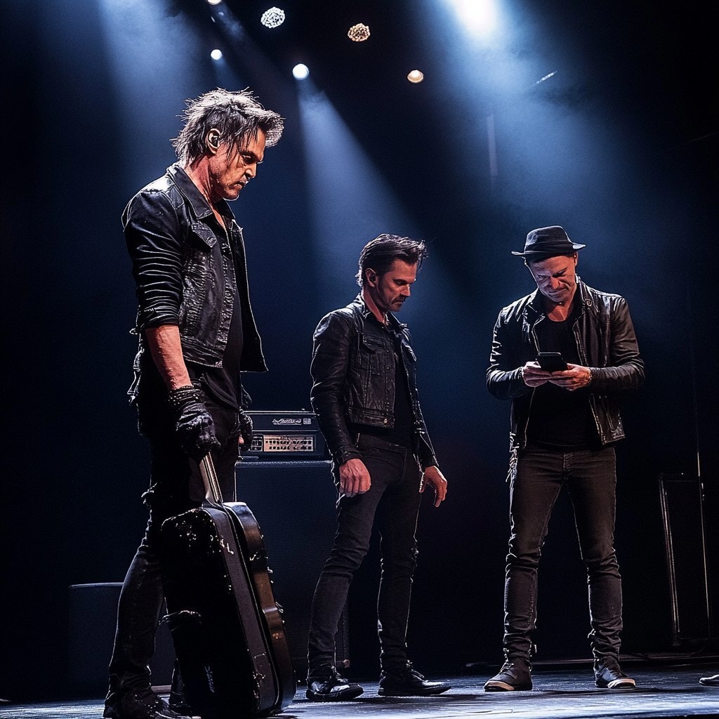 Создано на основе запроса: Cinematic 16:9 image. Wide shot. 2 shot. Standing on stage. On the left, a disheveled 35 year old rock star dressed in all black, working as a roadie. On the right, 2 other men. One is a younger, spry-looking 30 year old rockstar, holding a guitar case. The other man on the right, is a 45 year old music manager, staring down at his phone as he types. --- Автоперевод: Кинематографический 16: 9 Изображение. Неплохо получилось? 🤔 https://dzen.ru/id/65c0c65c86e4f837c27b24d7 #ИИ #AI #нейросеть #midjourney #art