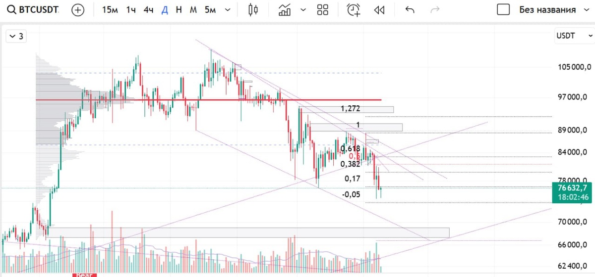 Получается, что уровень 76500 является поддержкой. Дальше только 70 000. Поэтому, если сейчас не удерживаем, спокойно идём на 70 000. Я бы давал, даже 66 000. Что сейчас говорит за рост ⬇️ Есть уровень, от куда откупают. Не дают цене уйти ниже. Вероятное образование двойного дна. Нижняя граница полос Боллинджера. Много ликвидности сверху. Вполне вероятен поход к 82 000. А там уже нужно смотреть 👌