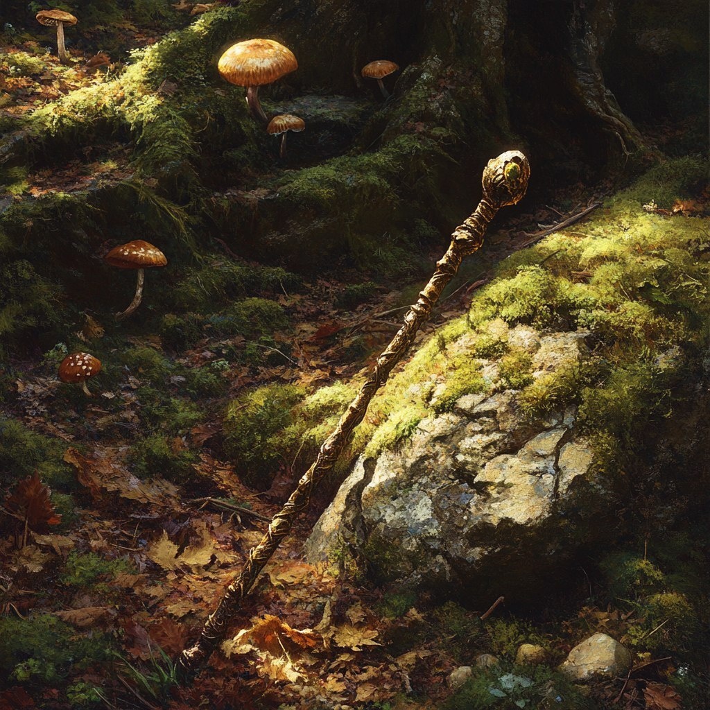 Создано на основе запроса: a magic staff on the forest ground, surrounded by moss and mushrooms