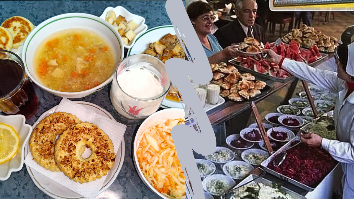 Как было положено в советских столовых, обед будет состоять из первого — это суп гороховый, на второе — гуляш из мяса с отварной гречкой, на закуску — салат из белокочанной капусты, вместо компота из сухофруктов сегодня будет сладкий чай с лимоном, ореховое кольцо к чаю и, конечно же, пол стакана сметаны с сахаром.