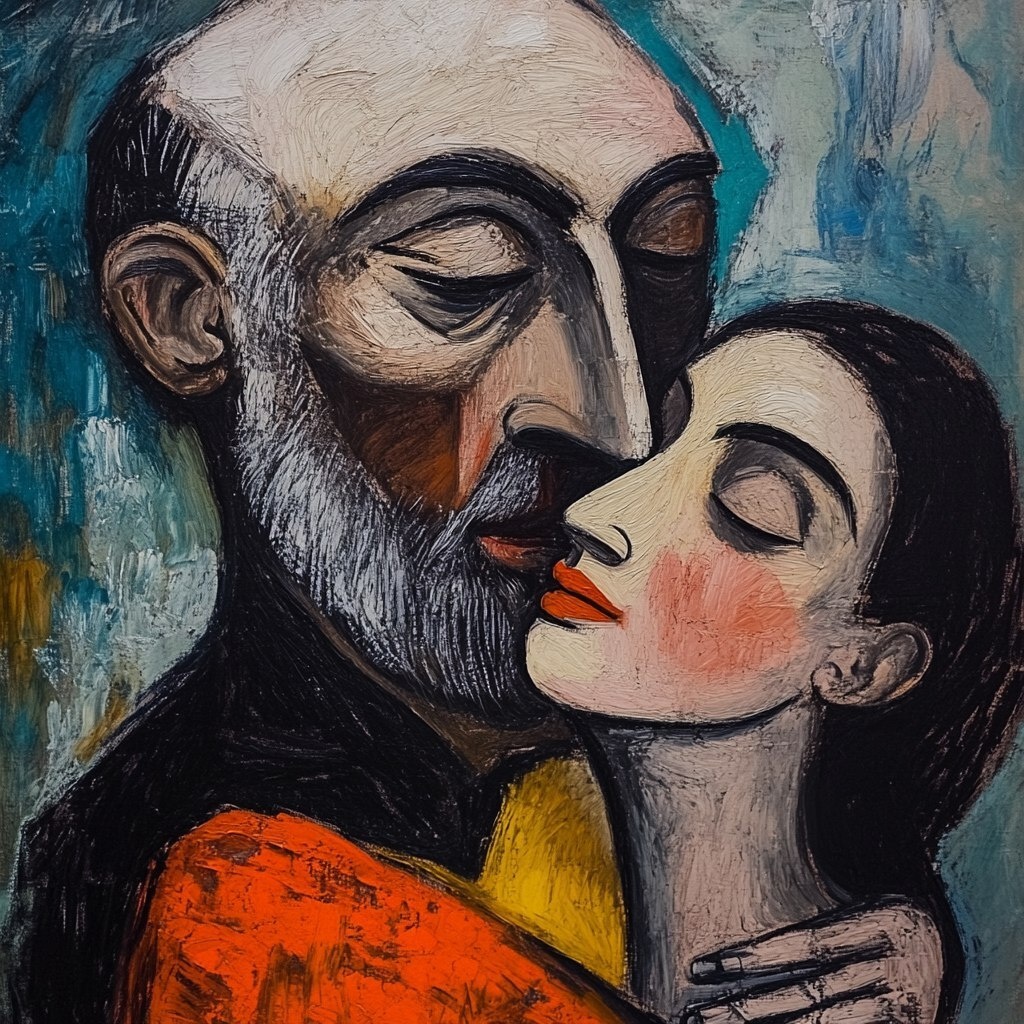 Создано на основе запроса: Pablo Picasso with a beautiful woman in an intimate, passionate embrace, soft focus, romantic and artistic