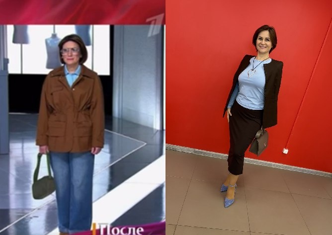 🤎💙 И конечно, сочетание коричневого с голубым - это хит сезона, который очень выигрышно смотрится не только в офисе, но и на прогулке. 💥 👖 Широкие джинсы с легкой потертостью мы оставим без комментариев - наши подписчики наверняка помнят, что именно такие мы рекомендовали буквально несколько дней назад ☝ Ребята, простите за качество фото с 1 канала 🙈😸 - это вам не в нейросети генерировать 😹