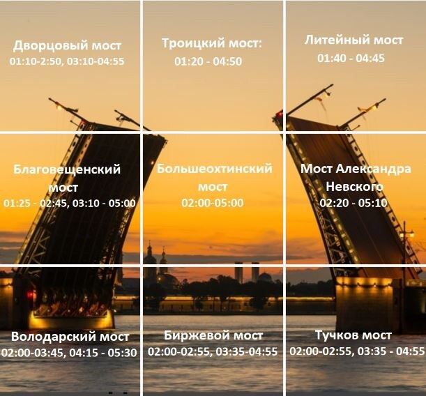 - Благовещенский мост: 01:25 - 02:45 и 03:10 - 05:00