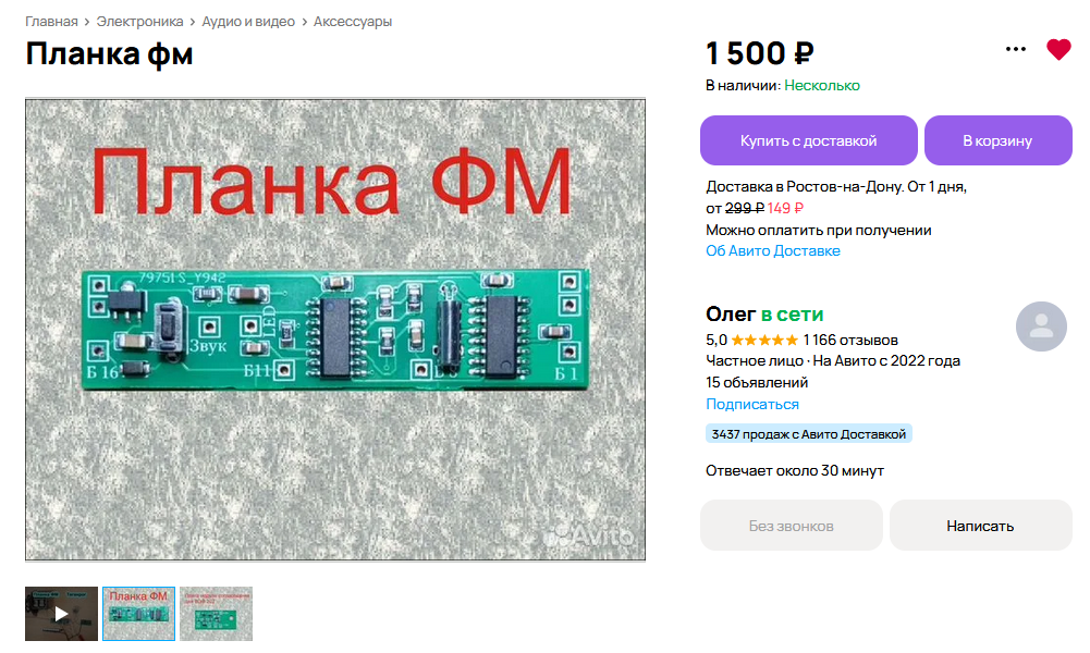 Добрый день дорогие друзья. Сегодня мы продолжим наш разговор о FM планках (модулях) начатый на моем канале в публикации Планки (модули) для переделки АМ-радиоприемников на FM, управляемых от штатных КПЕ для любых аналоговых и цифровых микросхем и Планки (модули) FM для переделки советских радиоприемников , все что о них известно в наше время в одном месте, есть также очень много информации близкой по теме на моем канале в подборке «Переделка на FM старых радиоприемников». На Авито и других досках объявлений полно объявлений от известных планкостроителей (не буду перечислять их поимённо, они всем и так известны) и их дилеров с предложениями различных FM планок и модулей, по не очень низким ценам. Вот к примеру самый дешевый вариант Судя по описанию к объявлению, это вариант планки «радиотехника Александра» на RDA5807FPи МК, и он единственный из всех планкостроителей который делится схемами, чертежами плат и прошивкой МК. При желании все его наработки можно найти через поиск. Следующая