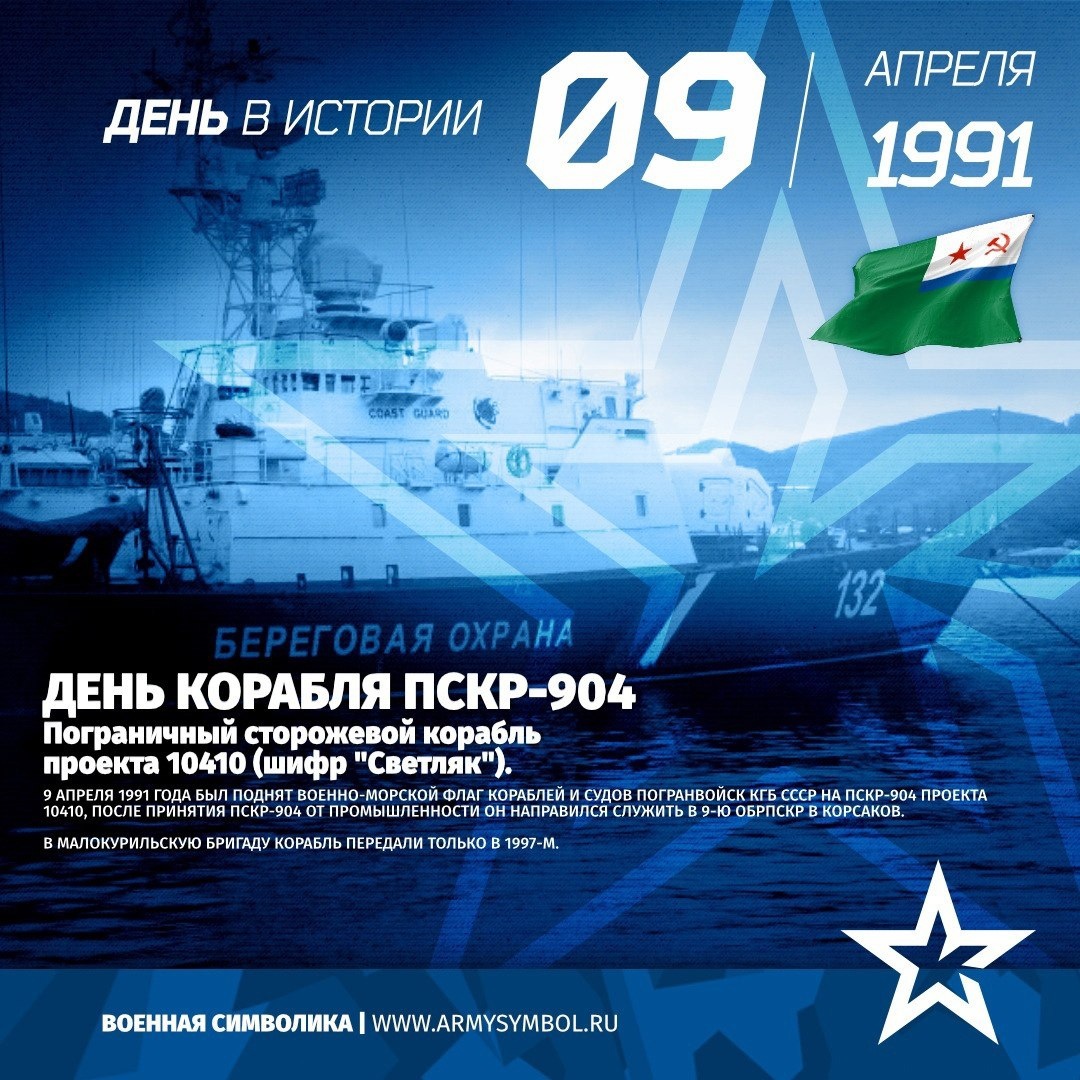 День корабля ПСКР "904" в 1991 Пограничный сторожевой корабль проекта 10410 9 апреля 1991 года был поднят военно-морской флаг кораблей и судов погранвойск КГБ СССР на ПСКР-904 проекта 10410, После принятия ПСКР-904 от промышленности он направился служить в 9-ю обрпскр в Корсаков. В Малокурильскую бригаду корабль передали только в 1997-м. #ПамятныеДатыВоеннойИсторииОтечества #ДеньВИстории #ГодЗащитникаОтечества #80ЛетВеликойПобеды Источник: https://vk.com/wall-60767131_30349 Подпишитесь на наши группы ВКонтакте и в Одноклассниках - читайте, смотрите и комментируйте! Источник