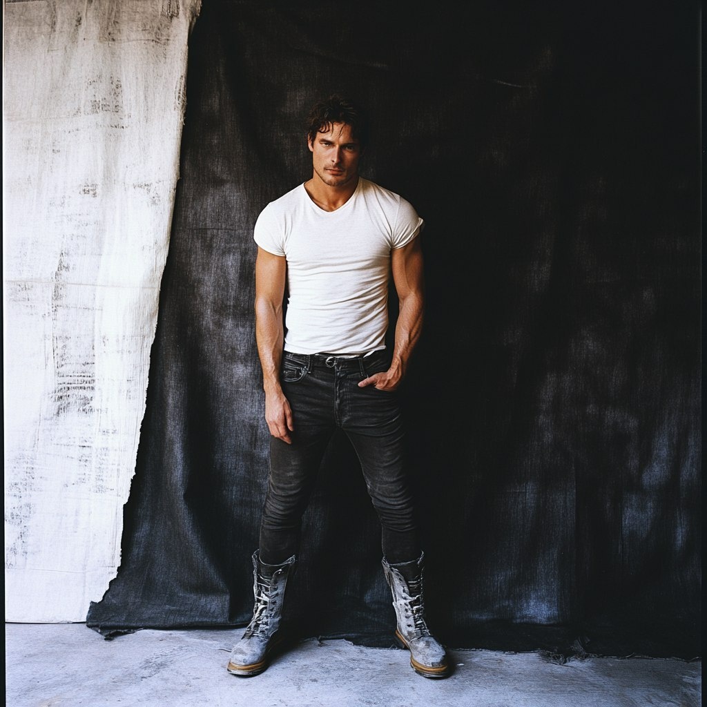 Создано на основе запроса: A vintage candid photograph of a handsome thin male model who is 35 years old. He is standing in in the stye of Vincent Gallo He is standing up looking at the camera He is wearing a vintage white t shirt. He is wearing Black moto jeans. He is wearing gray and white distressed leather Chelsea boots with black zippers He is wearing ankle length boots. He is in a photo studio with an old black fabric background. The image has a Polaroid film-like aesthetic captured with a 35mm lens. The high-resolution hyper-realistic and cinematic style creates a sense of realism. The photo is head on portrait style in the style of behind the scenes rock documentary Captured in high-resolution photography using a Hasselblad X2D 100C