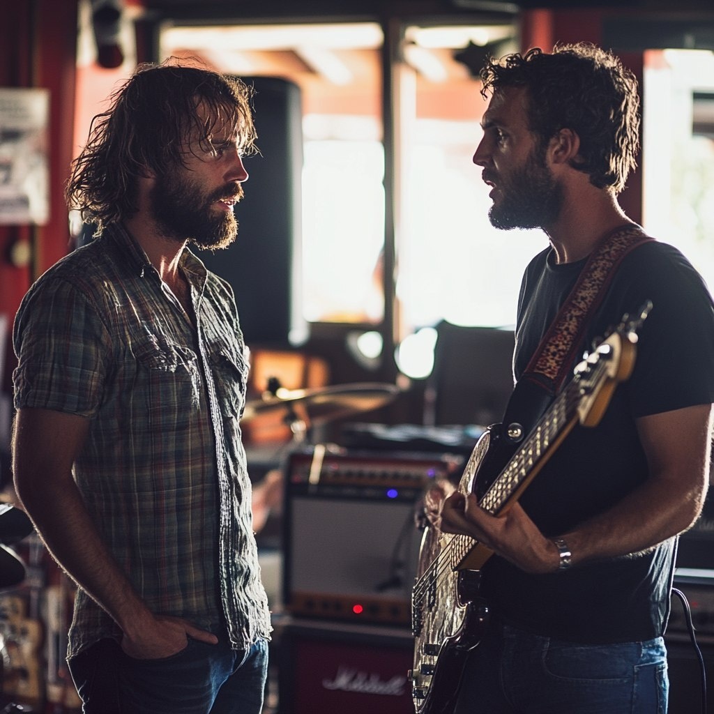 Создано на основе запроса: Cinematic. Daytime scene. Inside a small music venue. Late afternoon. Australia. A disheleved 35 year old rock musician talks frustratedly with an innocent 30 year old musician.