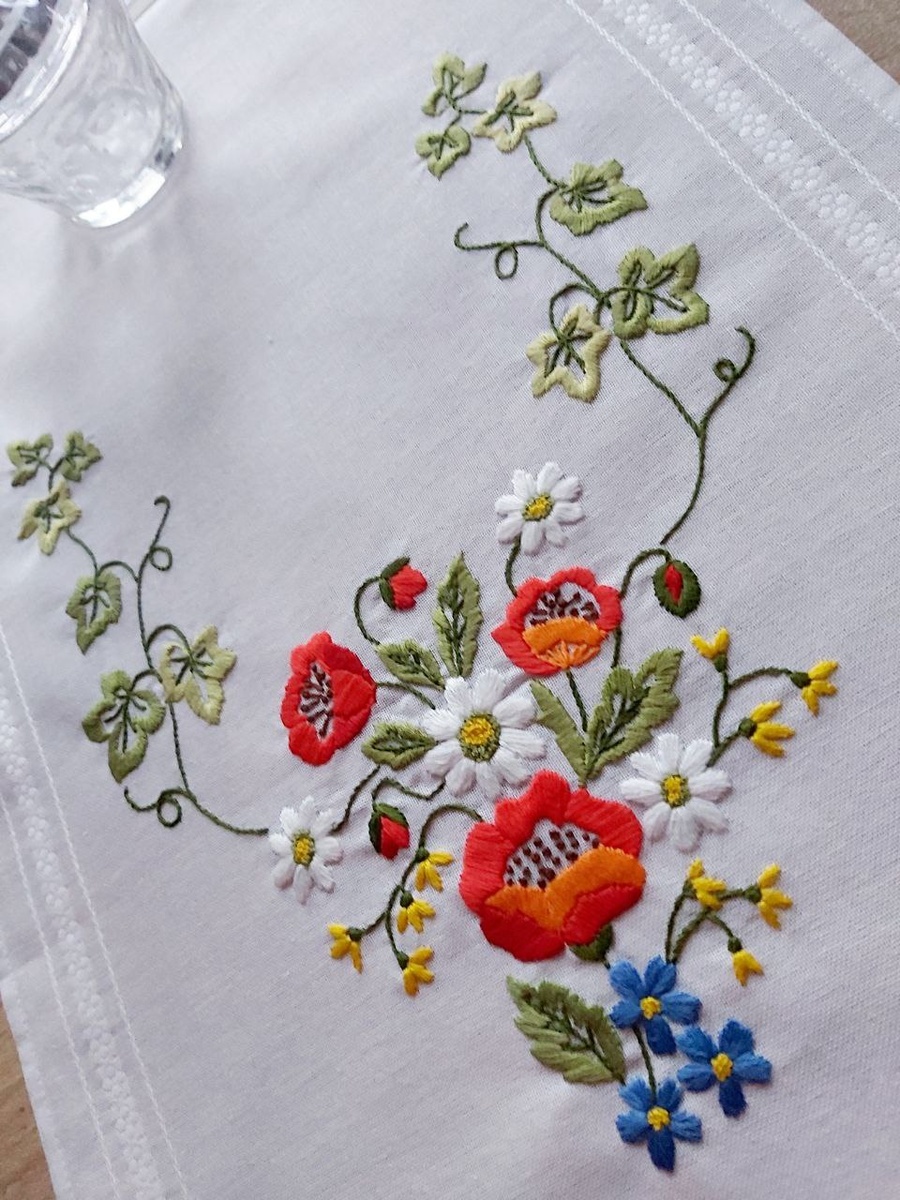 Когда-то очень давно я иногда вышивала дизайны, созданные другими авторами. Мне, как начинающему дизайнеру, было интересно поучиться, подсмотреть как сделан тот или иной фрагмент вышивки. Так случилось, что моя коллега и давняя подруга Людмила Инякина подарила мне набор набор по вышивке гладью от бельгийской фирмы VERVACO. И мне захотелось протестировать этот набор - посмотреть как сделана схема, написана инструкция, достаточно ли ниток в наборе и ... Отнеслась я этому творчески и посмотрите что из этого получилось. Сначала я вышила дорожку, посмотрите фото процесса вышивки. На базе дорожки я сделала обучающий мастер-класс по вышивке простой гладью, на котором разобрала все основные элементы вышивки, показала как они вышиваются. И создала несколько небольших самостоятельных мастер-классов по вышивке простой двусторонней гладью. Эти дизайны я не отшивала, просто нет времени, показываю вам несколько цветных схем. Какое впечатление я получила от этого набора? Если оценивать по пяти-бальн
