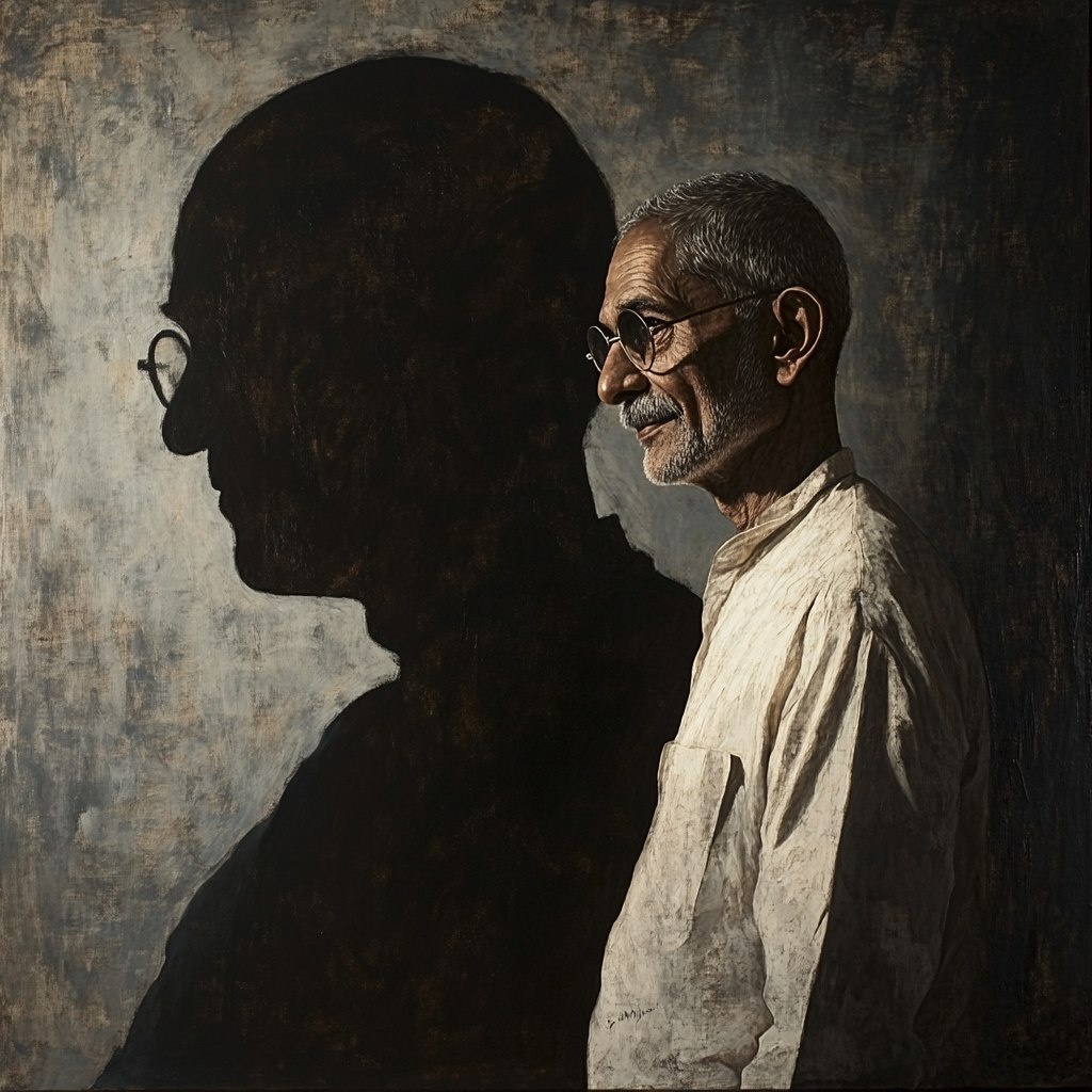 Создано на основе запроса: A dark shadow looming over a portrait of Gandhi, representing the criticism he faced, somber atmosphere
