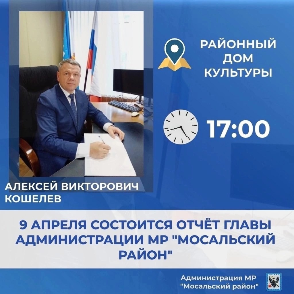 📢 Уважаемые жители нашего района! Уже сегодня состоится отчёт Главы администрации МР "Мосальский район" Алексея Викторовича Кошелева о работе администрации района. 🔹Будут подведены итоги социально-экономического развития в 2024 году и обозначены задачи на 2025 год. 📞 Перед началом отчета члены регионального правительства проведут прием по личным вопросам. Запись по телефону: 2-15-24. В случае, если у вас не будет возможности присутствовать лично, организуют прямой эфир в социальной сети ВКонтакте. Подключайтесь к трансляции, чтобы не пропустить важные обсуждения и решения. #АдминистрацияМРМосальскийРайон