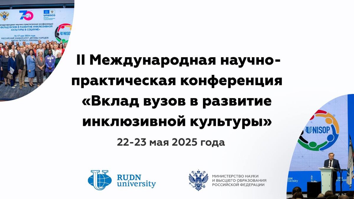 😍 В Москве пройдёт международная конференция по инклюзивному образованию 🟤 22–23 мая 2025 года в Российском университете дружбы народов им. Патриса Лумумбы состоится II Международная конференция «Вклад вузов в развитие инклюзивной культуры». Мероприятие пройдет под эгидой Комиссии РФ по делам ЮНЕСКО. #️⃣ В рамках Конференции состоится: 1. Совещание замминистра науки и высшего образования РФ Ольги Викторовны Петровой с кураторами инклюзивного образования в вузах России. 2. Встреча с представителями Совета Минобрнауки по вопросам повышения доступности инклюзивного высшего образования. 3. Тематические секции, круглые столы, стратегическая сессия, дискуссионные площадки. Для участников предусмотрены: — Возможность выступить с докладом (заявки принимаются на сайте). — Получение удостоверения о повышении квалификации (18 академических часов) после завершения Конференции. 🔸 Для участия в Конференции необходимо зарегистрироваться на сайте до 21 мая. 👀 Контактное лицо: София Маркова (