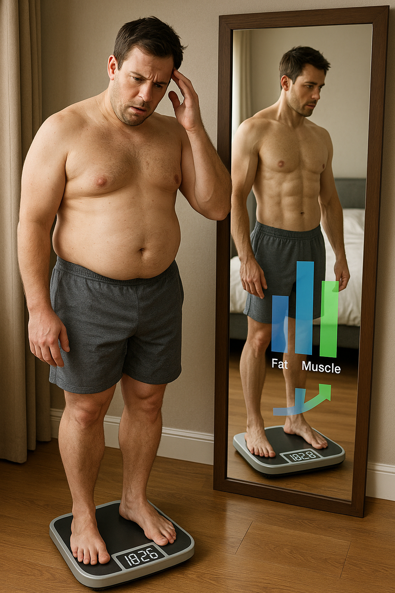 📌 Хватит. Весы — это не показатель прогресса, а источник тревожности и ошибок. Ты можешь: Почему так? Легко. Вот лайфхаки: 📌 Да, и это именно то, что называется рекомпозиция. Вот как это работает: 1️⃣ На дефиците можно терять жир и набирать мышцы → вес почти не меняется, но тело — да