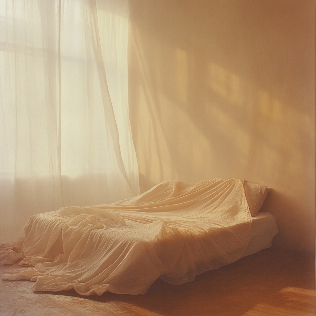 Создано на основе запроса: A warm-toned scene depicting a soft, gentle atmosphere in a simple room with a bed, a single light fabric draped